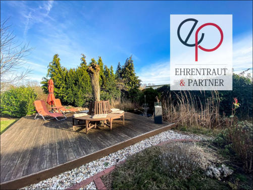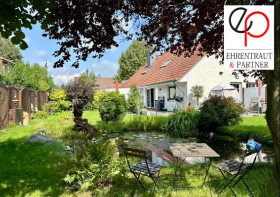 Keller, 4 Garagen/Stellplätze Einliegerwohnung mit separatem Eingang Gäste-WC, Terrasse, Einbauküche Grundstück 1279 m², Garten mit Teich